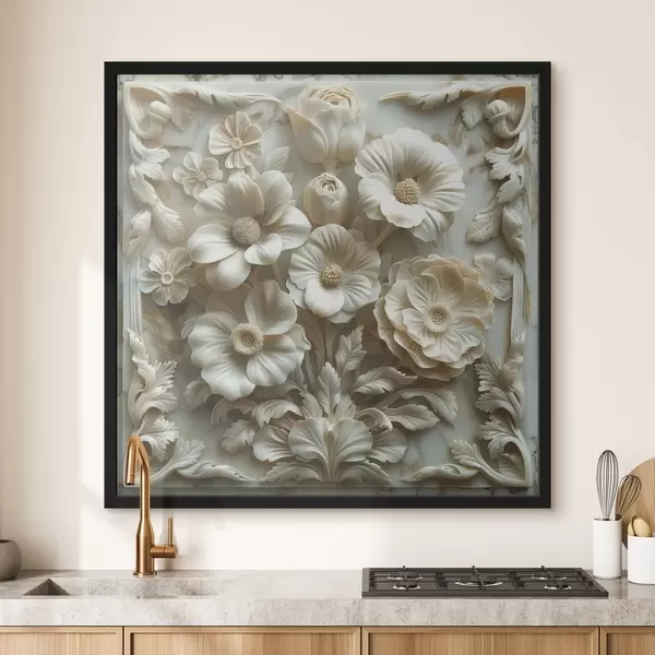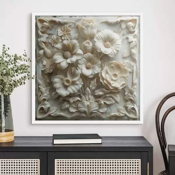 Poster flori 3D albe în basorelief pe un fundal de marmură cu un cadru Nr f39739
