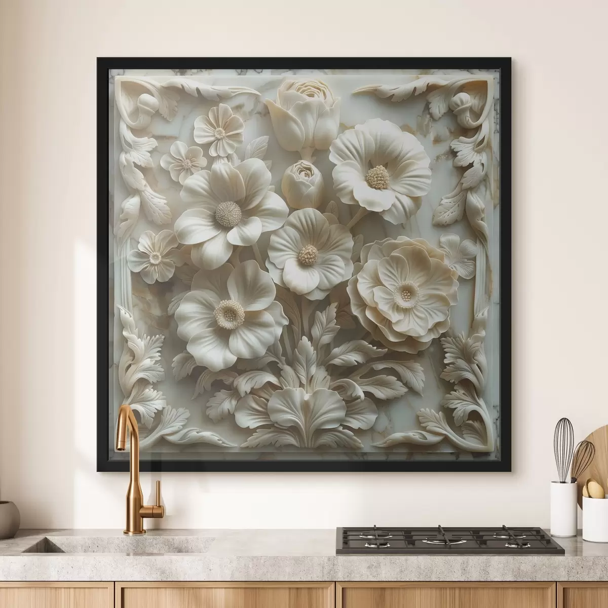 Poster flori 3D albe în basorelief pe un fundal de marmură cu un cadru f39739