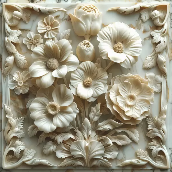 Poster flori 3D albe în basorelief pe un fundal de marmură cu un cadru Nr f39739