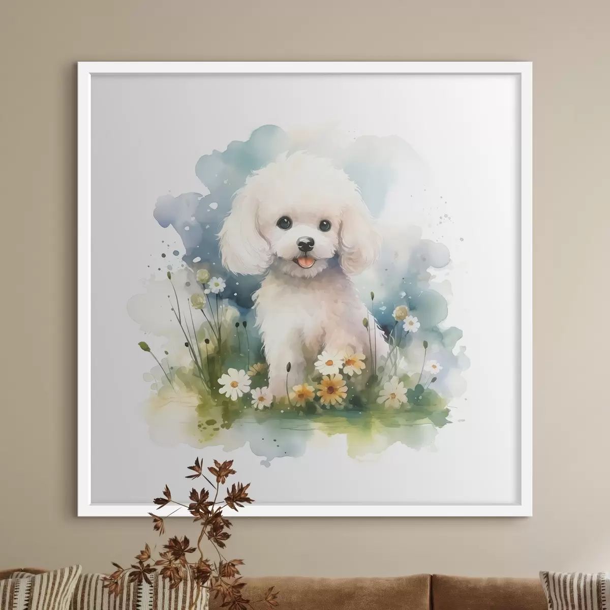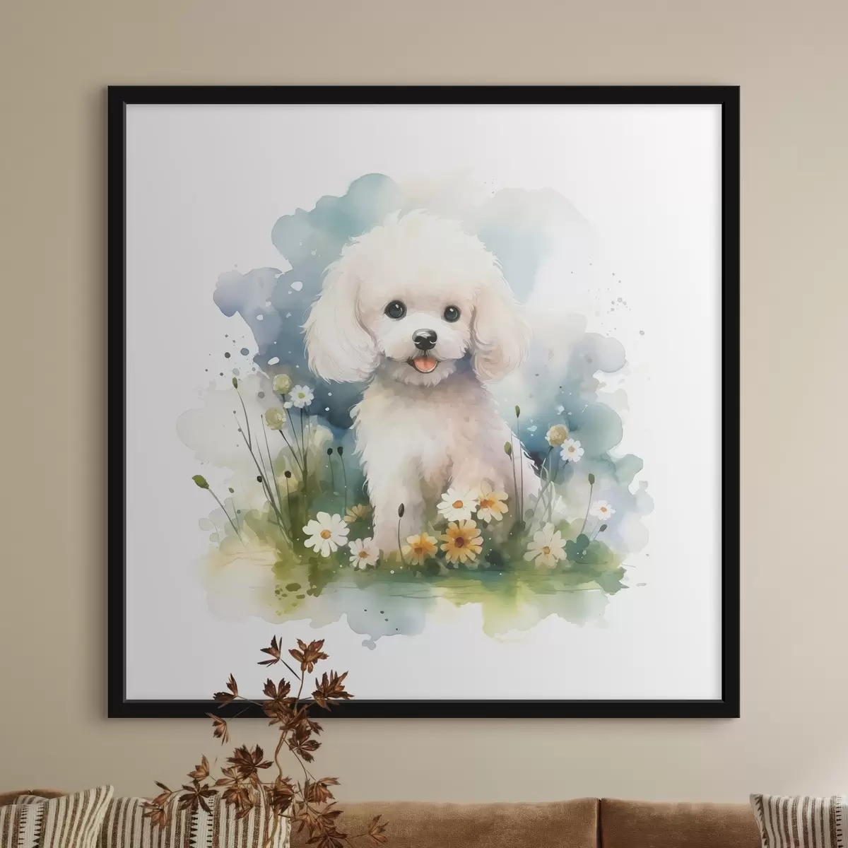Poster Mic pudel alb stând într-o acuarelă de flori Nr f39928