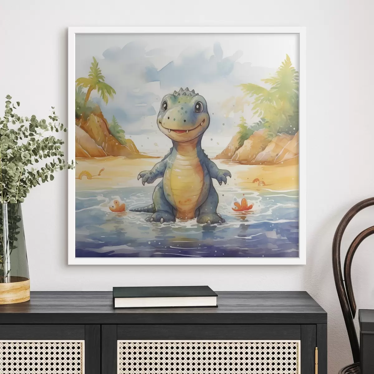 Poster Dinozaur în râu pe fundal de munți și ferigi acuarelă Nr f39930