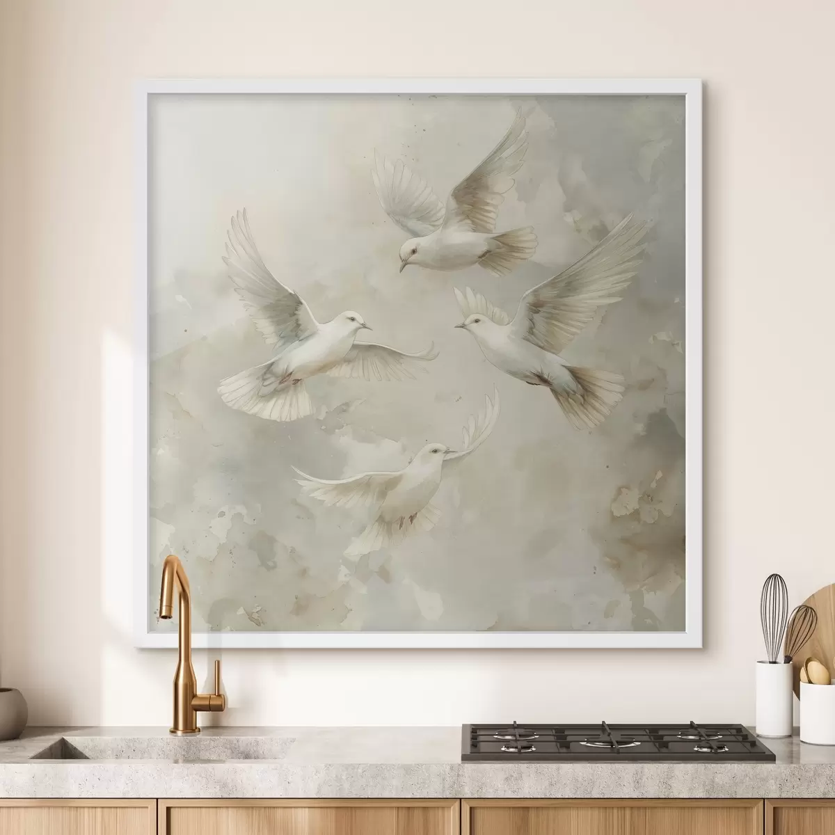 Poster Acuarelă păsări zburătoare, culori delicate bej și alb, porumbei Nr f39976