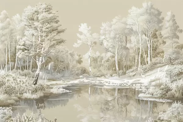 Poster Frumos peisaj forestier, iaz și copaci, culori bej și alb Nr f39979