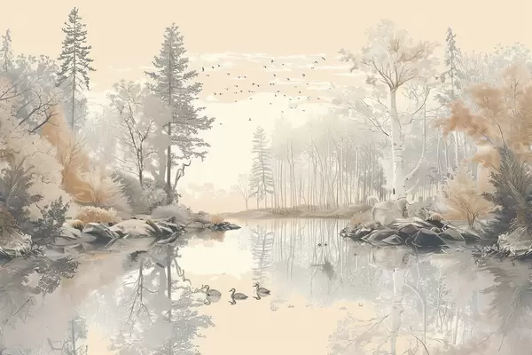 Poster Frumos peisaj natural, iaz și copaci, animale sălbatice, culori pastelate moi Nr f39980