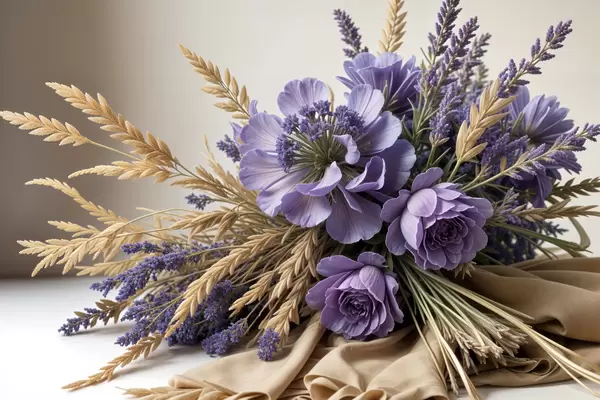 Poster Un buchet de flori mov, inclusiv bujori și lavandă, cu tulpini de grâu pe un fundal deschis Nr f40030