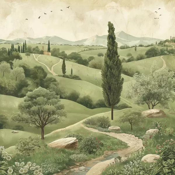 Poster Toscana peisaj, stil de epocă, culori pastel verde, dealuri și copaci Nr f40075