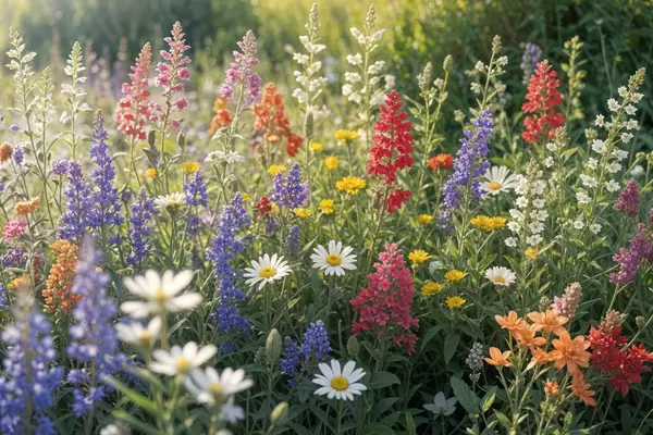 Poster O pajiște colorată cu flori sălbatice, cu diverse flori înflorite, inclusiv margarete, lavandă și flori roșii Nr f40390