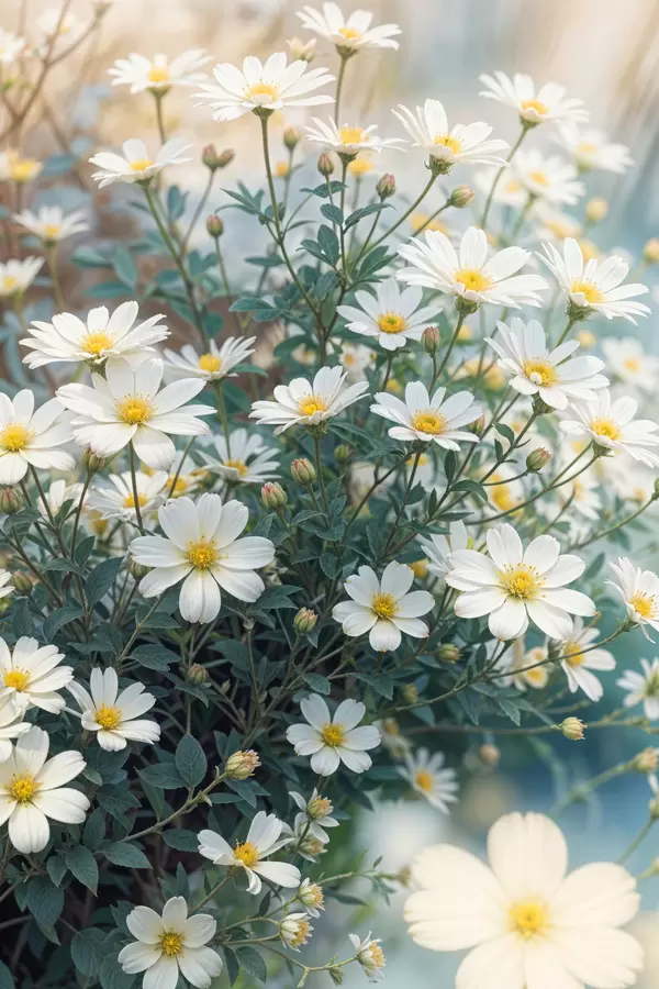 Poster Un câmp de flori albe de margarete cu frunziș verde, pe un fundal neclar Nr f40413
