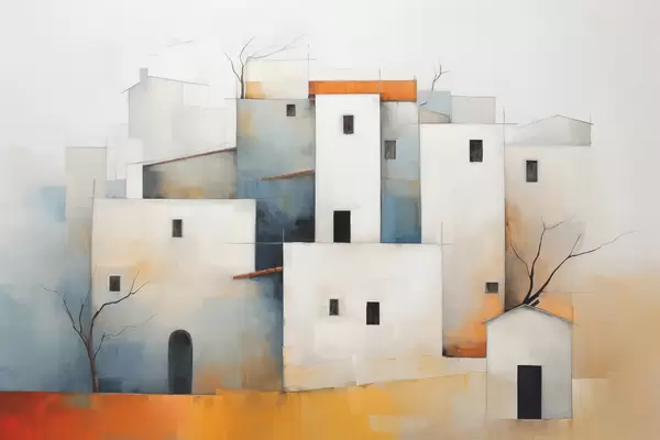 Poster Case albe stilizate abstracte, rosu, portocaliu, galben, albastru f40531
