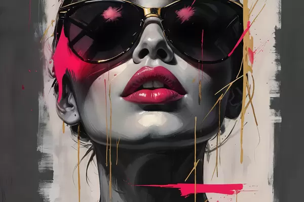 Poster Portret abstract al unei tinere femei în ochelari de soare cu buze roz și forme abstracte și stropi de roz Nr f40558