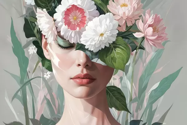 Poster O femeie ascunsă parțial de un buchet de flori mari, roz și albe, pe un fundal înverzit, cu frunze f40567