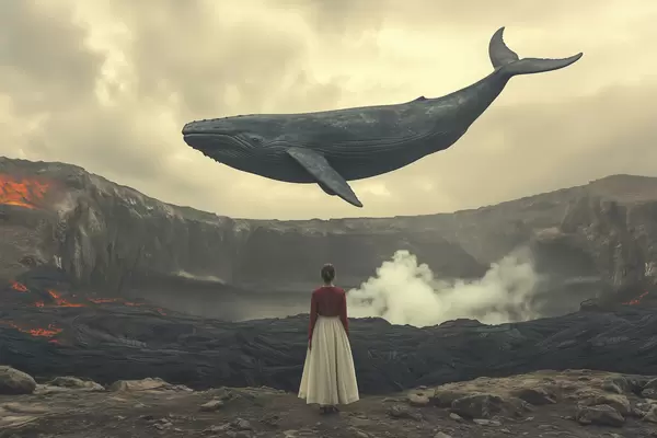 Poster Fată pe lavă cu o balenă zburătoare mare pe cer Nr f40986