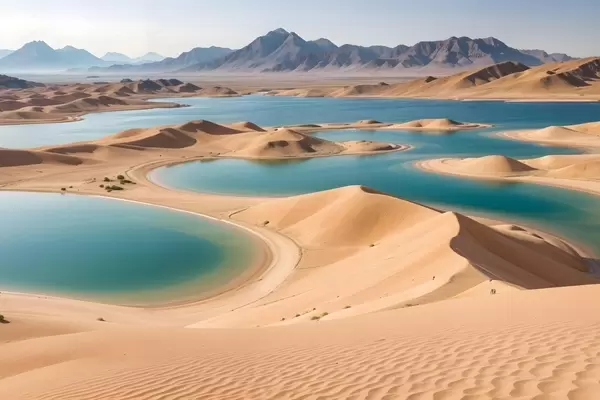 Poster Un vast peisaj deșertic cu dune de nisip ondulate și lacuri turcoaz, înconjurat de munți accidentați f41087