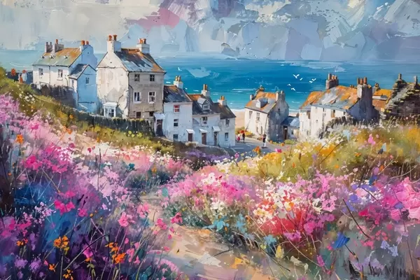 Poster O pictură în ulei colorat oraș de coastă cu case albe și o grădină de flori vibrante în prim-plan Nr f41090