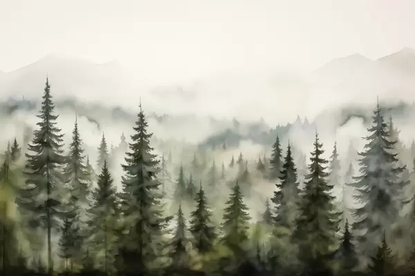 Poster Pădure verde pe fundal de munți munți și ceață acuarelă Nr f41241