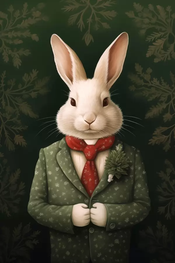 Poster Iepure alb într-un costum verde și cravată roșie ilustrare Nr f41278