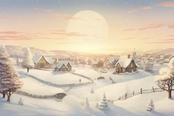 Poster Sat de iarnă în apus de soare, case acoperite cu zăpadă, copaci de pin Nr f41380