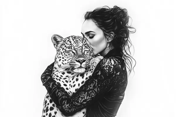 Poster Femeie sărutând leopard, desen în creion, animale sălbatice, alb-negru f41457