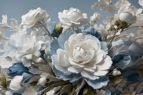 Poster Flori albe și frunze pe fundal albastru Nr f41527