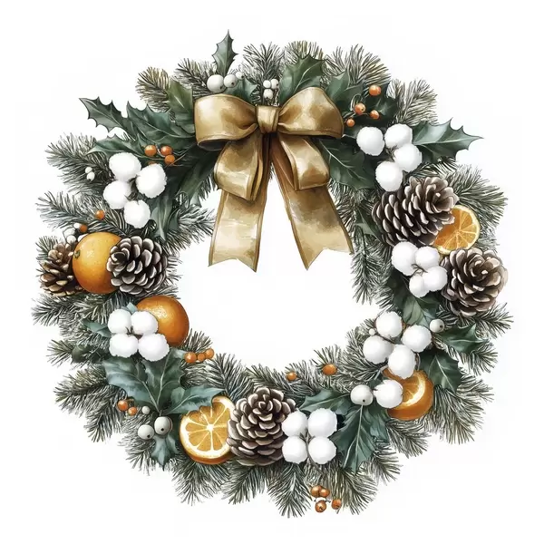 Poster Coroană de pin de Crăciun cu arc, bumbac, portocale, fructe de pădure și conuri Nr f41962