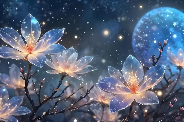 Poster Abstract fantezie flori pe ramuri cu petale texturate cu stele și o lună într-un fundal de cer de noapte Nr f42211