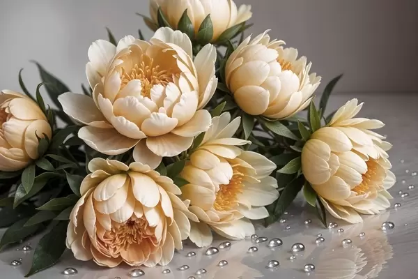 Poster Flori de bujor detaliate de culoare crem cu frunze verde închis pe un fundal gri Nr f42215
