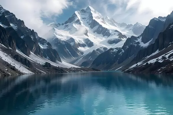 Poster Un vârf de munte acoperit de zăpadă reflectat într-un lac liniștit turcoaz, înconjurat de teren stâncos și nori dramatici Nr f42232