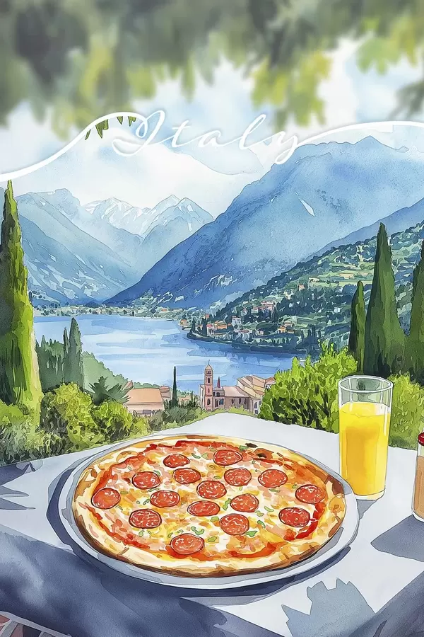 Poster Stil acuarelă, Italia, pizza, oraș vechi, peisaj montan Nr f42435