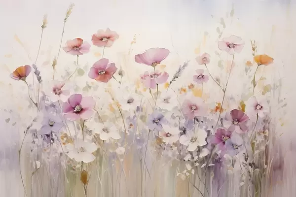 Poster O pajiște cu flori de acuarelă în nuanțe delicate de roz, violet și alb, creând o atmosferă de lejeritate și armonie. Nr f42557