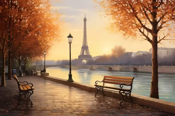 Poster Toamna la Paris, cu vedere spre Turnul Eiffel, malurile Senei acoperite cu frunze, bănci și felinare care contribuie la atmosfera romantică. f42577