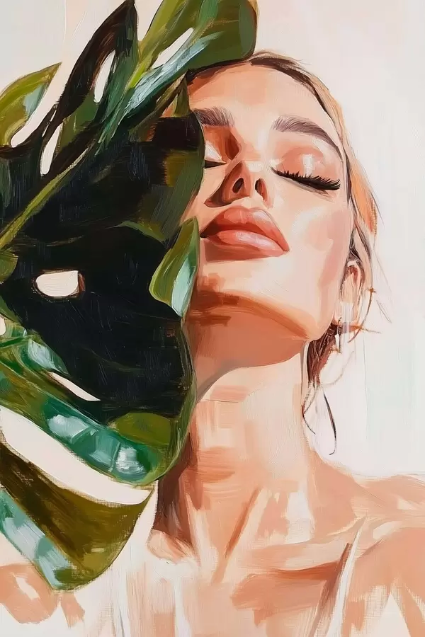 Poster Portret de femeie cu o frunză de monstera cu imitație de tușe Nr f42597