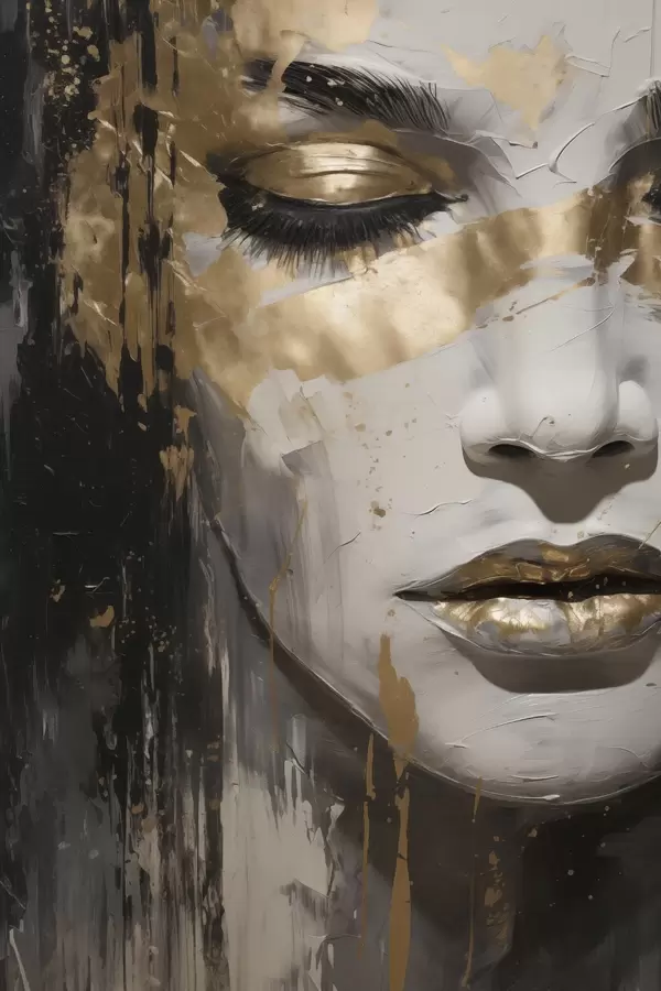 Poster Un portret abstract al unei femei care pune accentul pe ochii și buzele închise, executat în nuanțe de alb-negru cu tușe dinamice de culori calde. Nr f42626