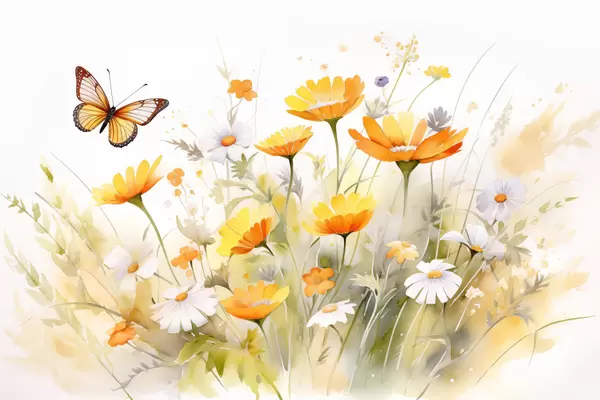Poster Un câmp vibrant de flori în formă de acuarelă, cu margarete albe și portocalii, cu un fluture fluturând în apropiere f42714