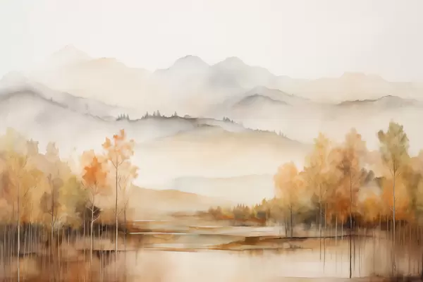 Poster Peisaj cu munți moi, cu un lac calm care reflectă peisajul și copaci cu frunze portocalii Nr f42716