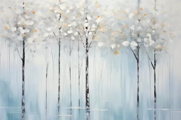 Poster Copaci înalți, subțiri, cu frunze albastre și accente de galben pe un fundal albastru moale, imitație de pictură în ulei Nr f42731