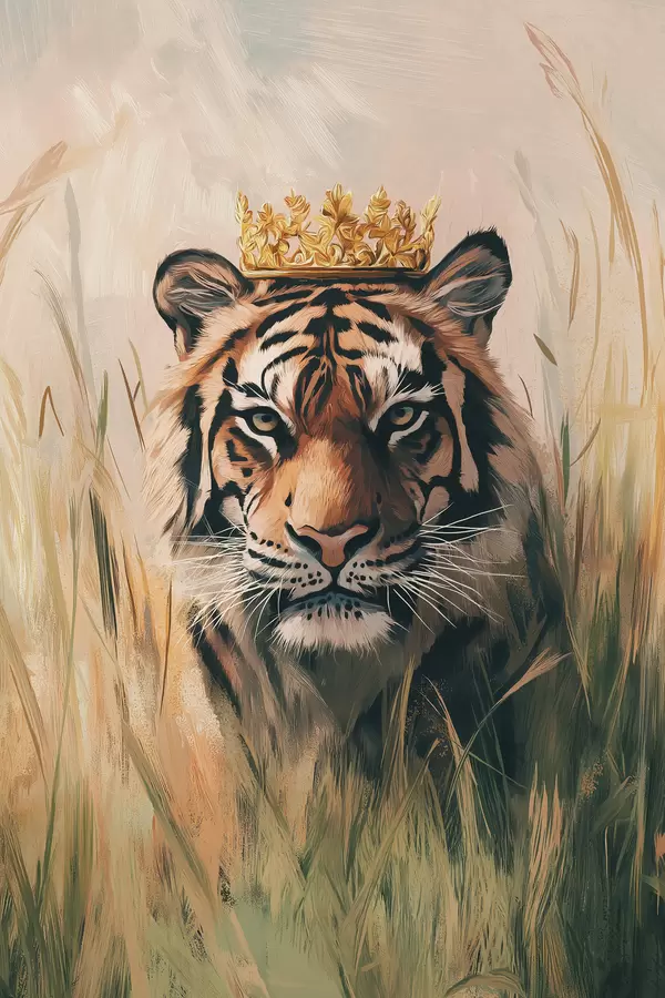 Poster Tigru într-o pajiște înverzită, coroană, pictură acrilică Nr f42783