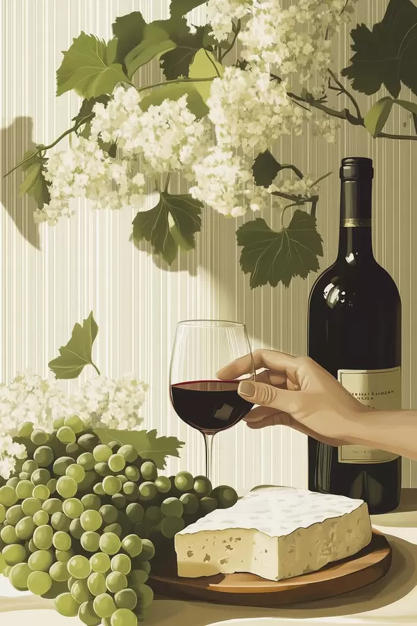 Poster Struguri cu brânză, sticlă de vin, stil vintage, flori albe f43052