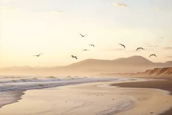 Poster Păsări care zboară deasupra plajei cu ocean, munți în fundal, culori calde, paletă pastel moale Nr f43162