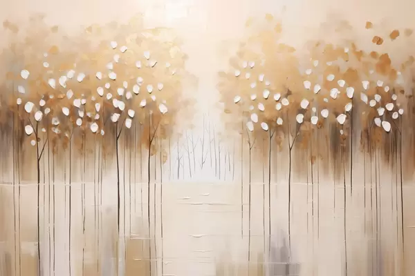 Poster Pictură în ulei imitație de copaci maro cu frunze albe într-o pădure cu un râu în mijloc, fundal alb Nr f43172