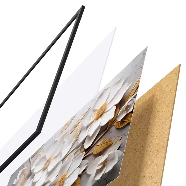 Poster Flori albe în stilul unei fresce în relief, cu frunze și stamine galbene f43330