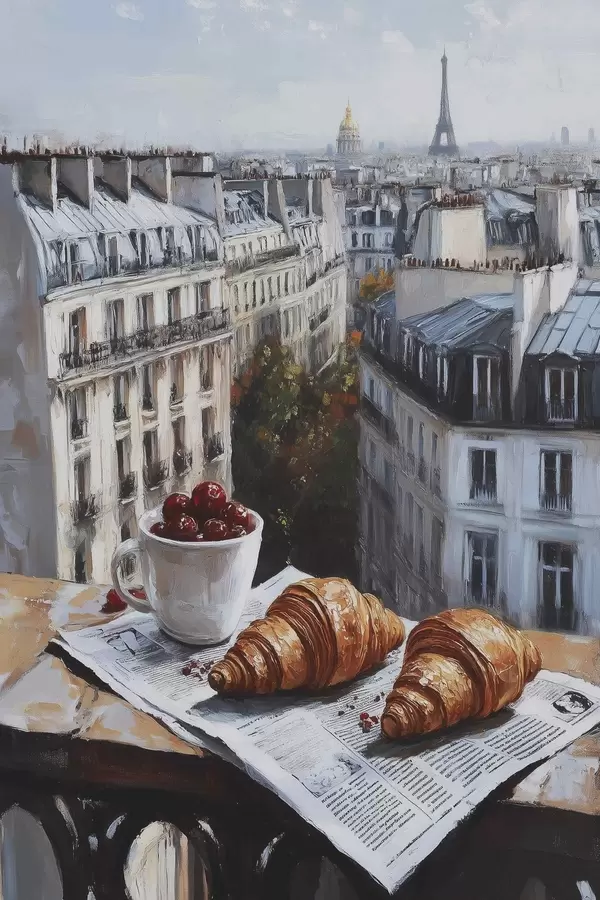 Poster Paris dimineața, cafea cu croissante, vedere la oraș, desen în stil ulei Nr f43892
