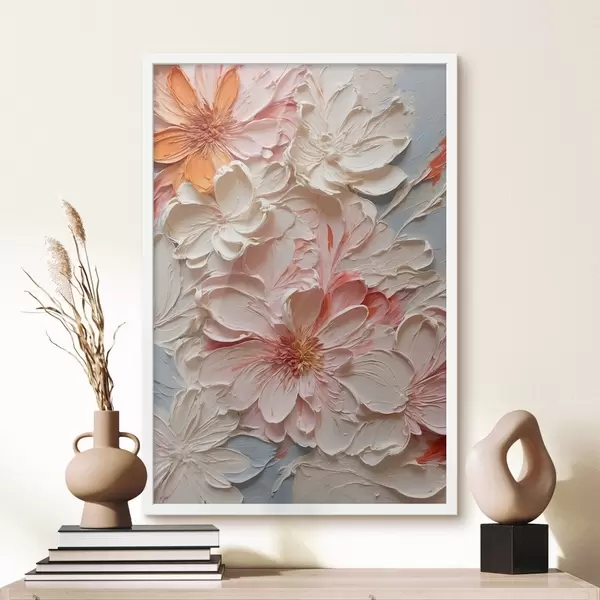 Poster Flori albe și roz pe fundal albastru în stil pictură în ulei f44074