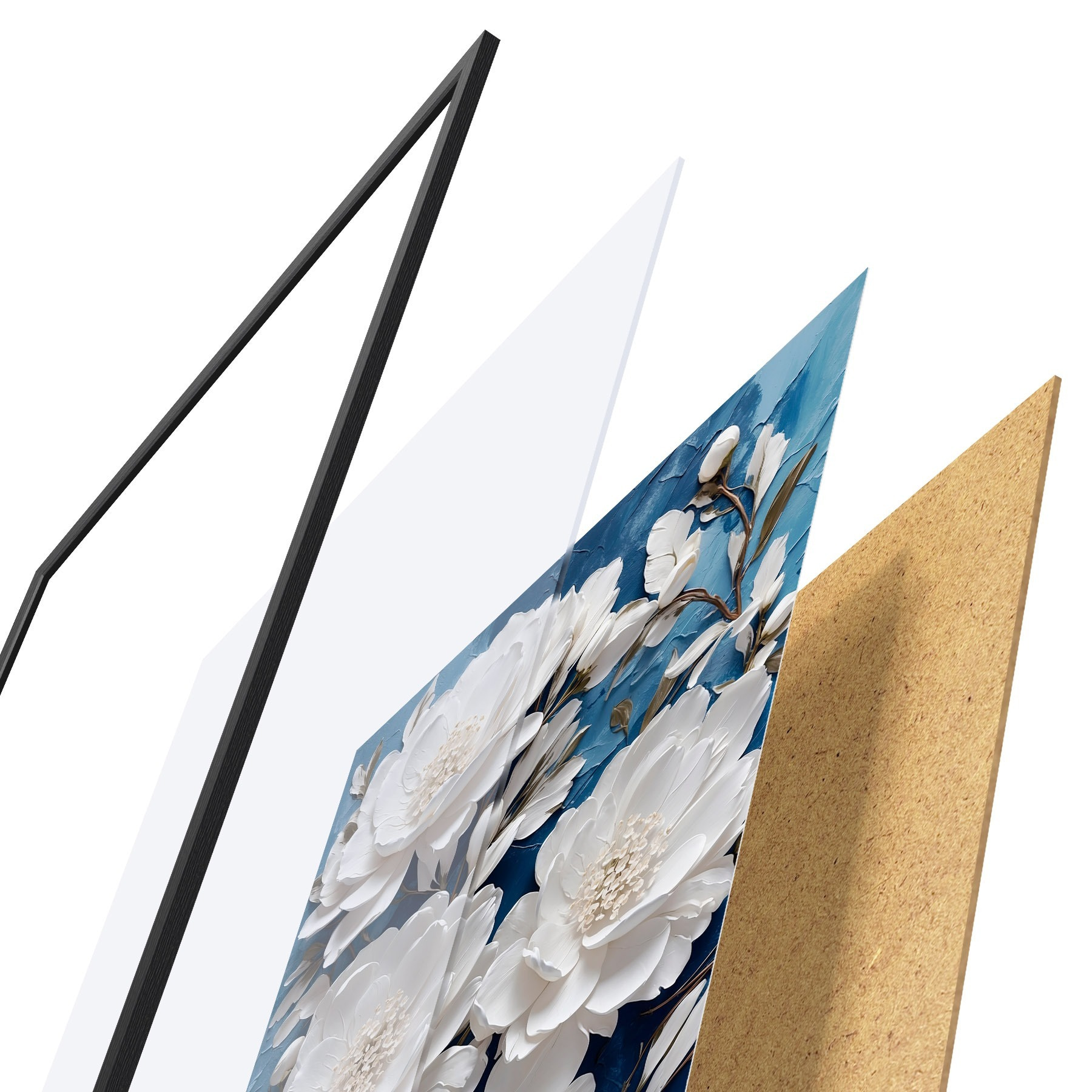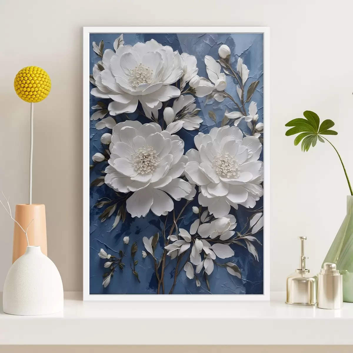 Poster Flori albe pe fundal albastru pictură în ulei Nr f44091