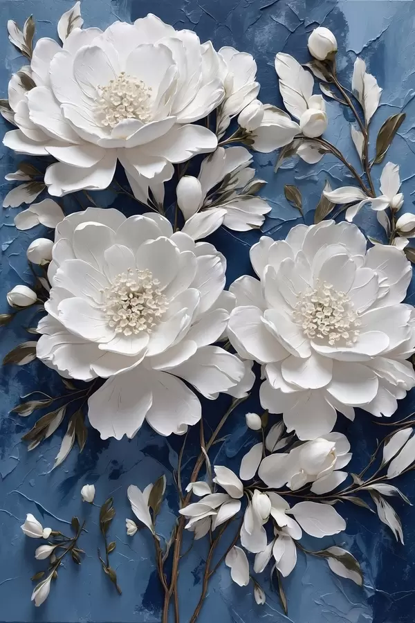 Poster Flori albe pe fundal albastru pictură în ulei Nr f44091