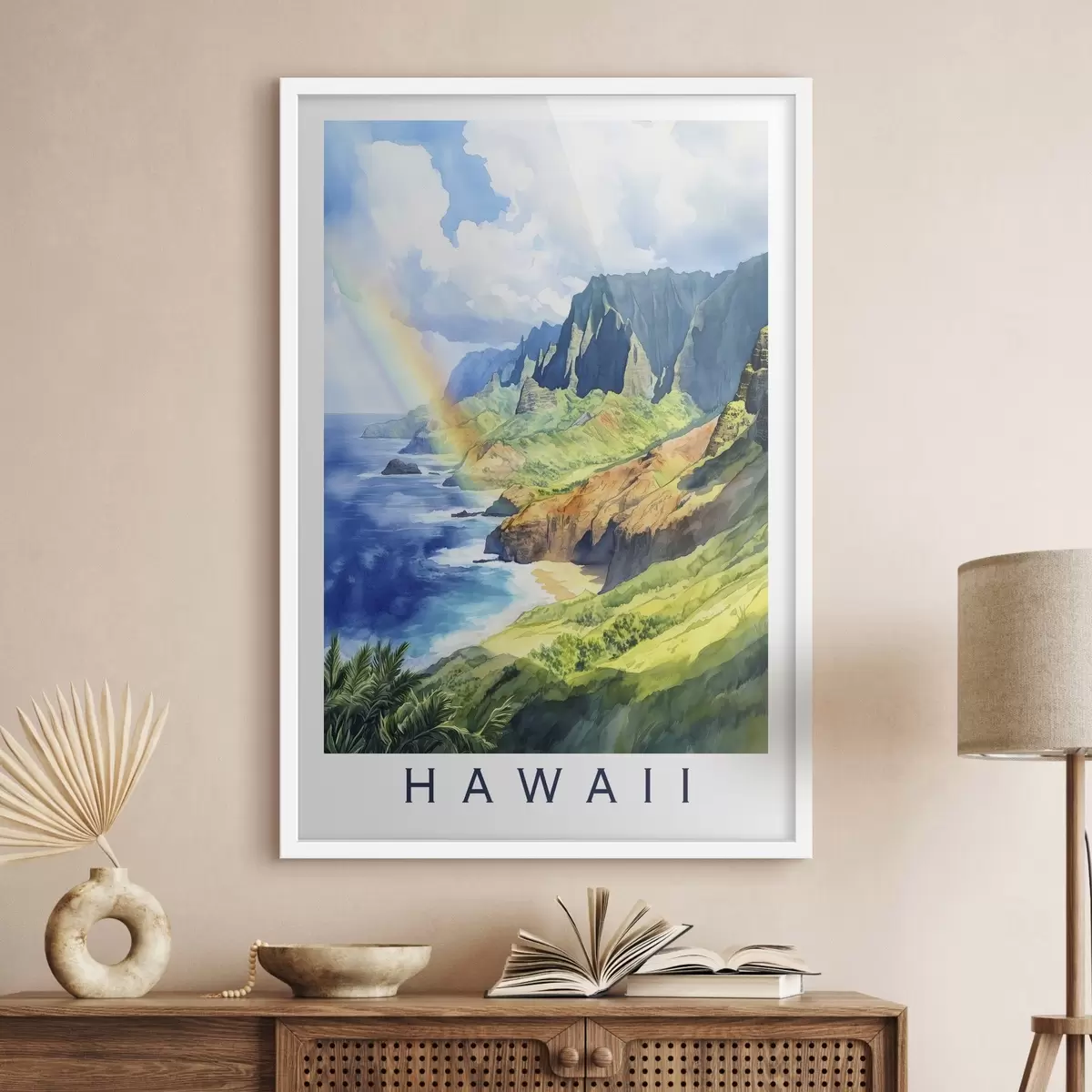 Poster Insula Hawaii, stil acuarelă, curcubeu, munți verzi, ocean f44141
