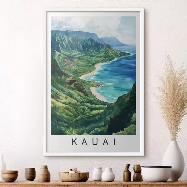 Poster Munți verzi, Hawaii, ocean, tropical, stil acuarelă Nr f44143