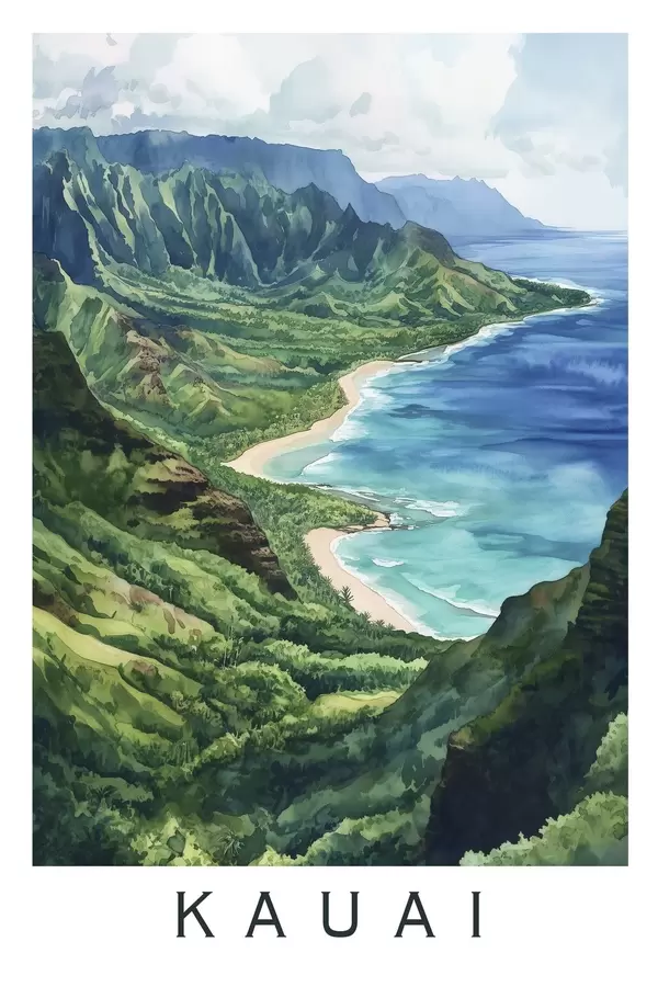Poster Munți verzi, Hawaii, ocean, tropical, stil acuarelă Nr f44143