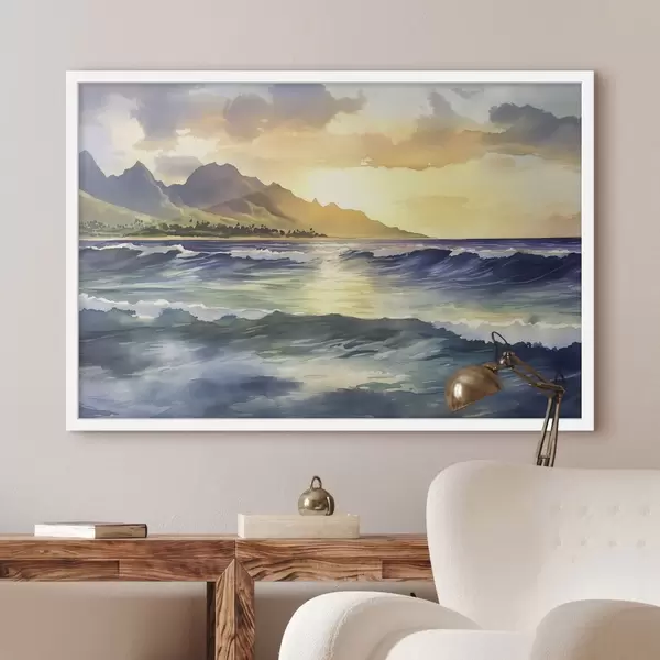 Poster Valuri de ocean, apus de soare, stil acuarelă, natură Nr f44147