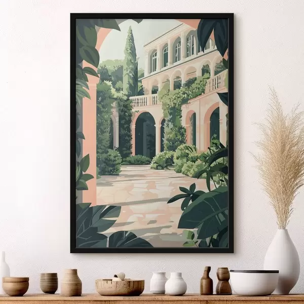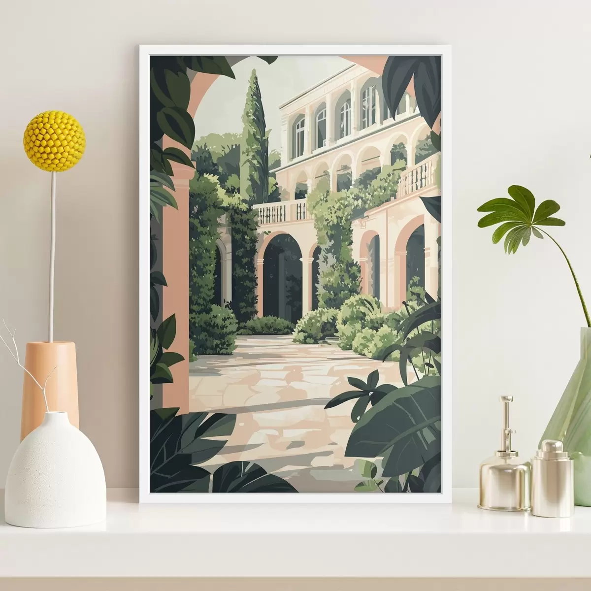 Poster Arhitectură mediteraneană, natură tropicală, stil plat, vilă cu grădină Nr f44150