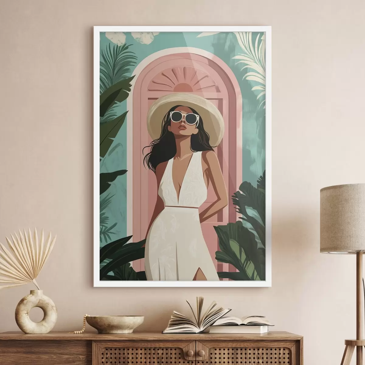 Poster Femeie în ochelari de soare și pălărie, natură tropicală, arhitectură f44152